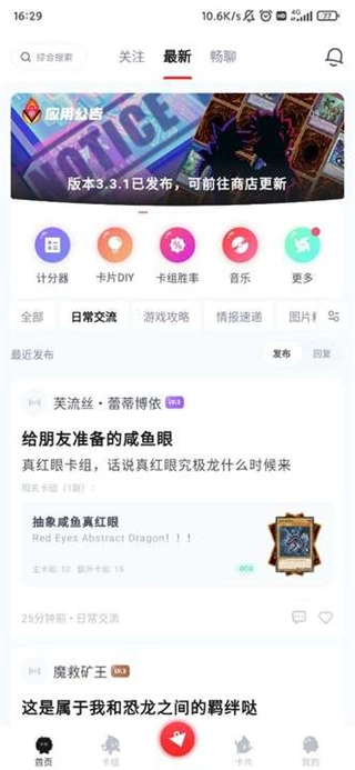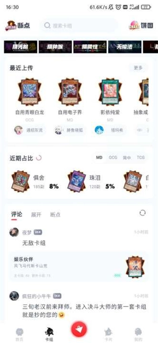 1、玩家无需登录,就能直接体验这款软件,正常使用并查看各类信息。软件首页设有诸多趣味游戏王功能,注册登录后,还能与其他牌友进行交流。