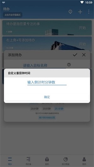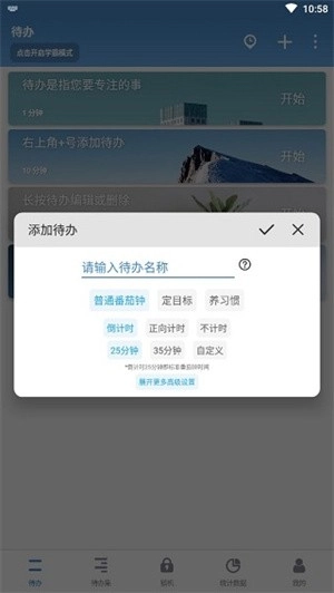 点击左上角的加号就能添加番茄钟。你可以选择时间和频率,时间分为5、25、35分钟,如果你觉得预设的时间长度都不适合你,你也可以自定义时间。