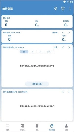 9、在数据统计界面,你能够看到所有计时的完成情况与专注时间的分布。