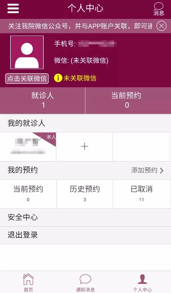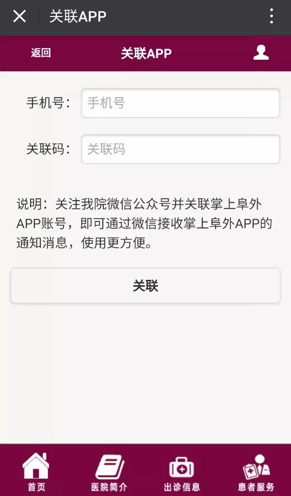 3、打开微信客户端,进入我院公众号,点击底部菜单进入关联界面,输入手机号和关联码。关联成功后会返回微信个人中心,在此可查看与微信的关联状态。的个人中心也会同步显示。