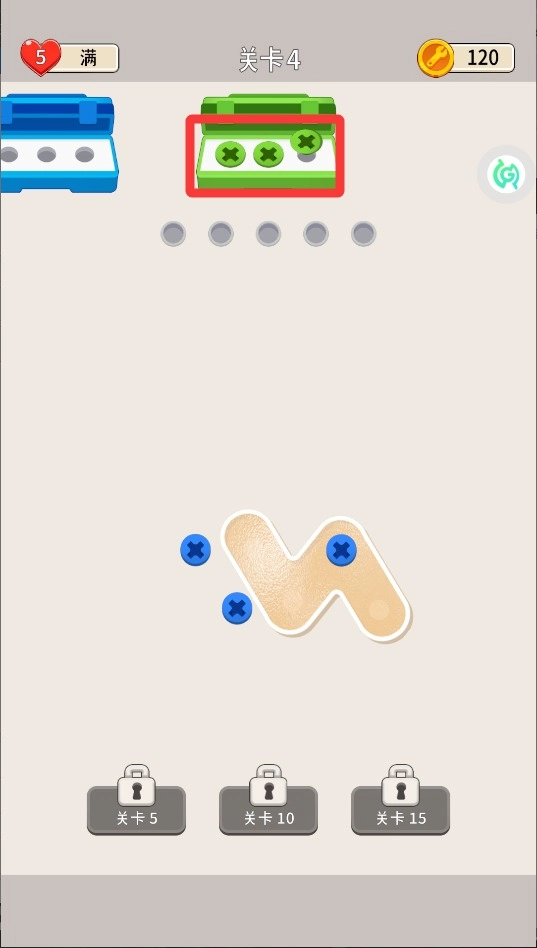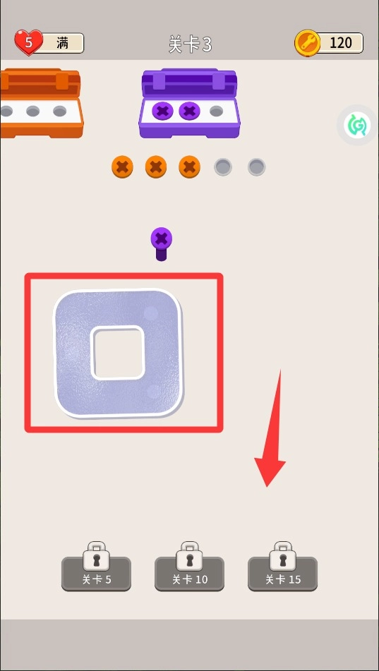 2、当三个相同颜色的螺丝相邻时,系统会自动消除,尽量创造连锁反应机会,这样能一次性清理更多障碍提高效率。