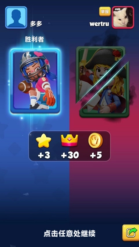双方回合都结束后,直接统计三消分数,分数高的一方获胜,胜利的一方获得皇冠等奖励,失败的一方失去皇冠,并被撕掉卡牌。