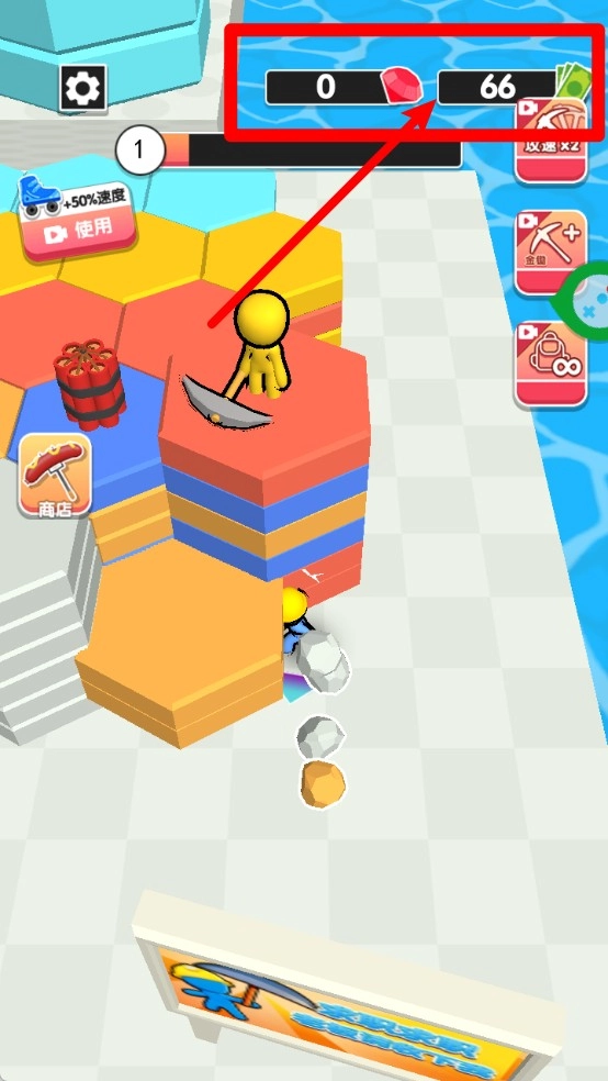 2.矿石与货币收集:右上角显示当前拥有的宝石与金币数量,采集矿石后可贩卖换取金币,用于升级各种功能。