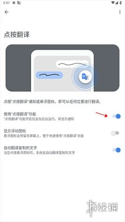 3、在点按翻译页面中找到“启用”选项,点击右侧按钮即可开启实时翻译功能。
