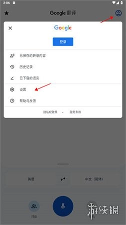 1、打开谷歌翻译应用,点击“设置”。