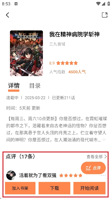 4、任意点击一部作品的封面进入到其详情页,如图所示,这里可以将作品加入书架,,点评,查看目录等。