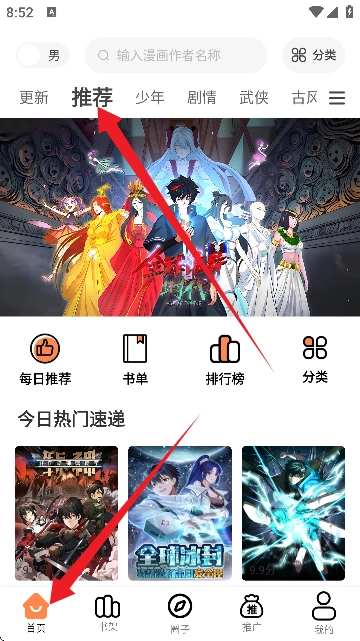 3、然后进入到软件首页中,如图所示。这里能为大家推荐诸多热门精品漫画资源。