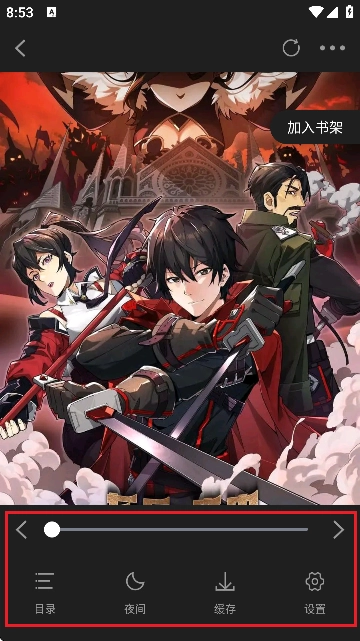 5、点击开始阅读进入到正文界面,如图所示,功能面板中支持查看目录,日夜间切换,缓存,设置阅读界面效果等操作。