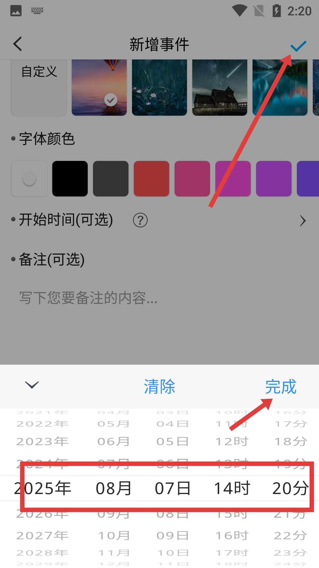 4、设置好时间后点击完成,再点击右上角【对勾】保存事件即可。