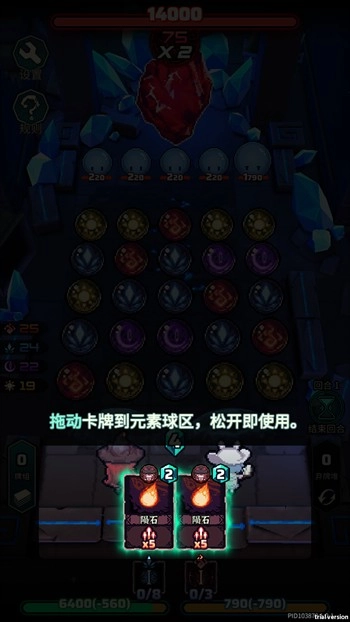 2、游戏的玩法就是卡牌+三消,玩家可以拖动卡牌到元素球区,松开使用。