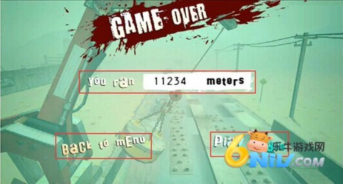 7、珍惜你的生命值吧,遭受僵尸攻击或误踩陷阱都会减少生命值,当它降至零时,游戏将宣告结束。中间显示的为你最后的跑酷距离,点击左边的“BACK TO MENU”可以返回菜单,而右边的“PLAY AGAIN”则可重新挑战。