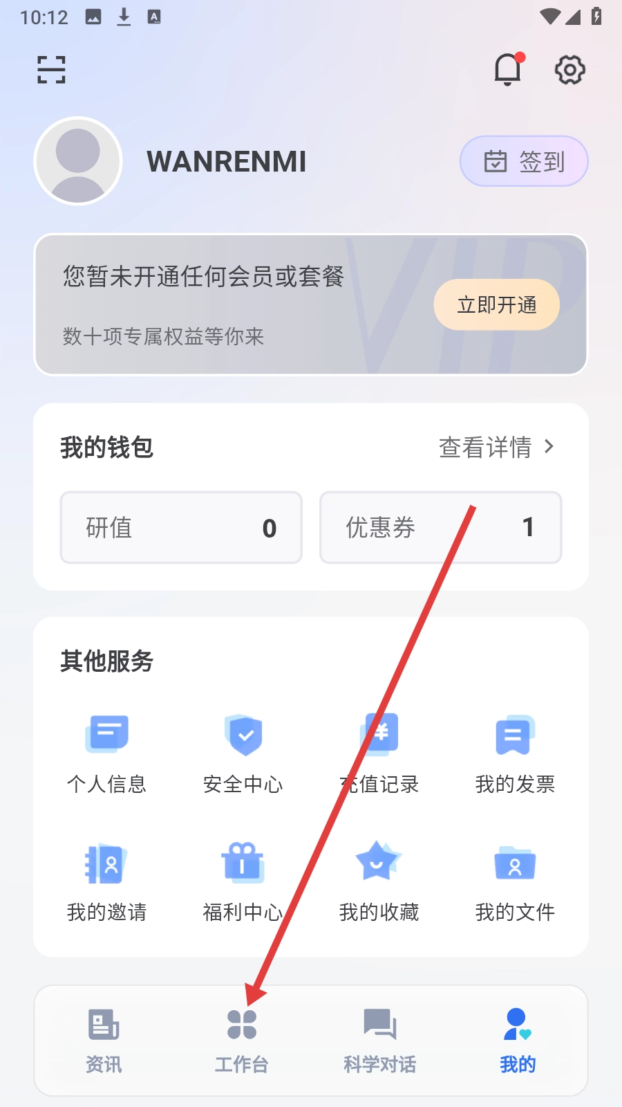 1. 于我的页面点击【工作台】,从而进入功能集合界面。