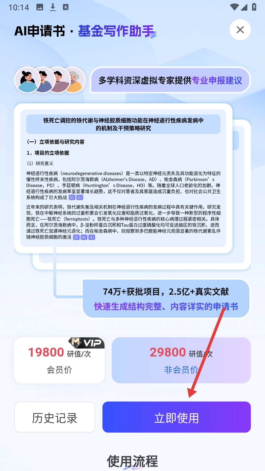 4、进入助手页点击【立即使用】,即可免费开始生成基金申请书。