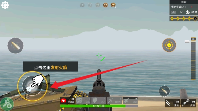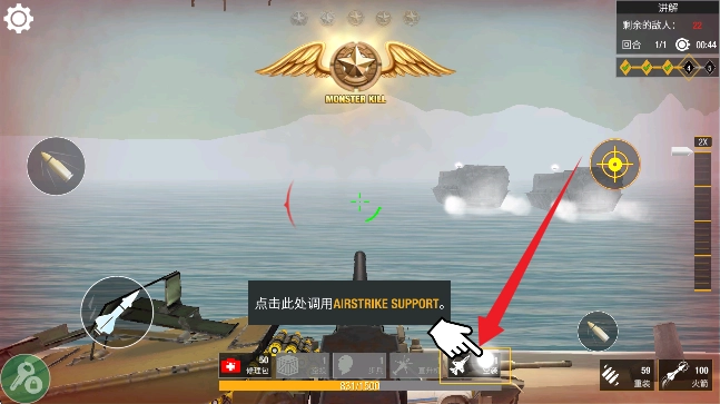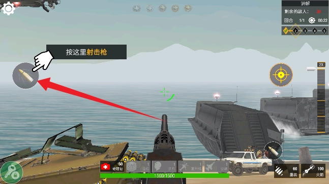 2、会有一段新手指引,如图所示,点击箭头所指的地方可以进行瞄准。