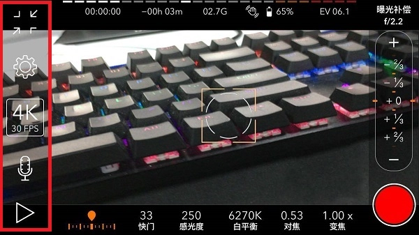 2、进入拍摄界面,包括缩放屏幕、设置、4k30fps、录音和播放等选项,用户可根据需求选择使用,