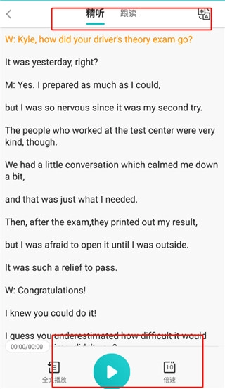 3、用户可以选择精听或是跟读,选择精听的话,用户可以自己调节倍数,点击全文播放即可开始收听;