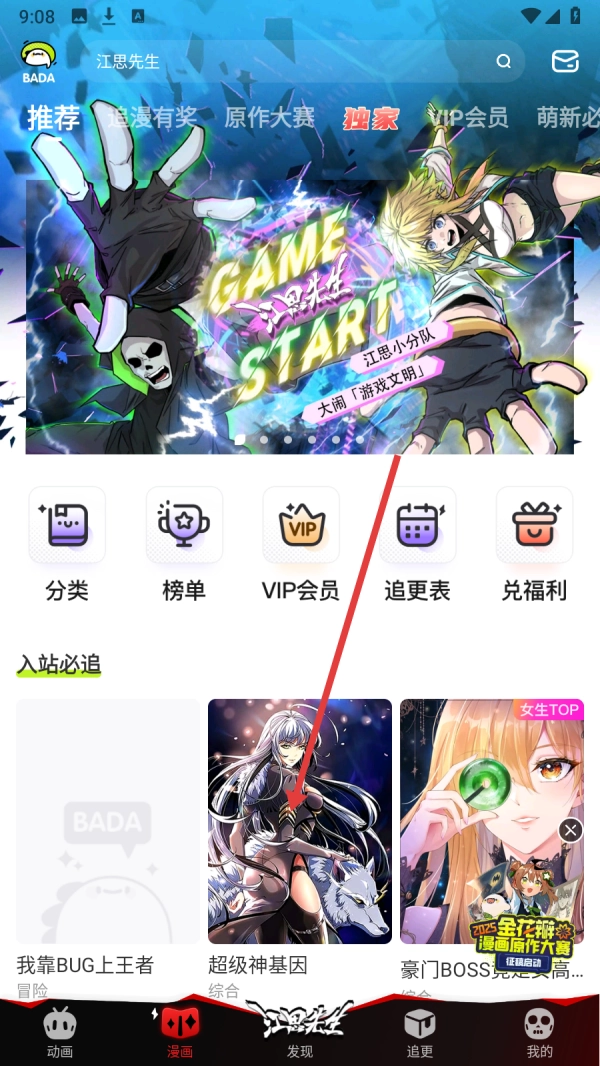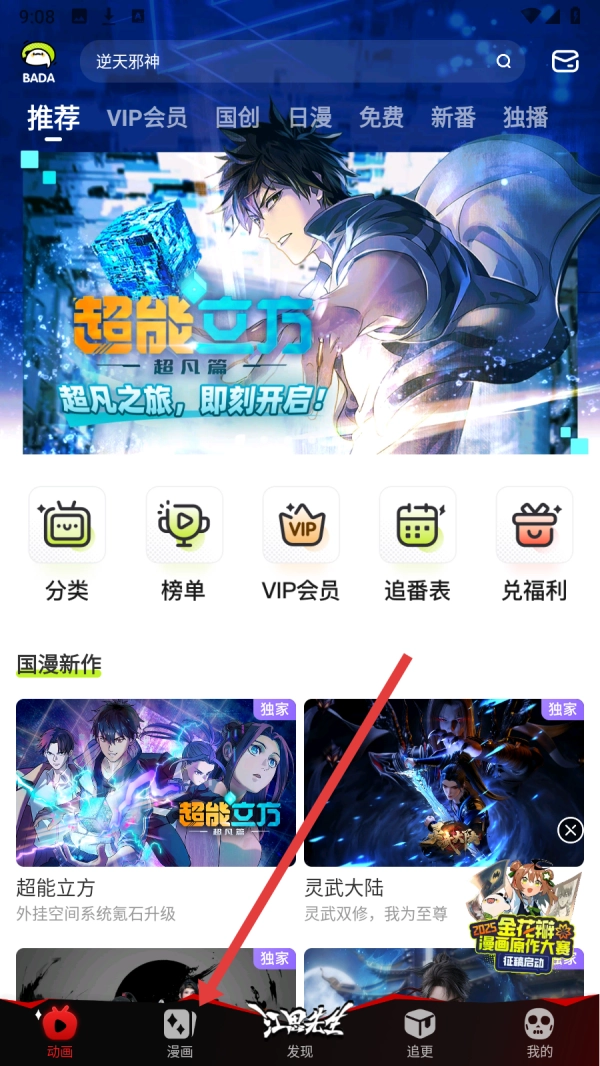 1. 于首页点击【漫画】,从而进入漫画推荐页面。