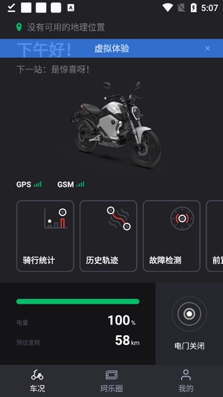车况:一键车检、车辆定位、剩余电量、行驶里程、骑行轨迹、数据统计;