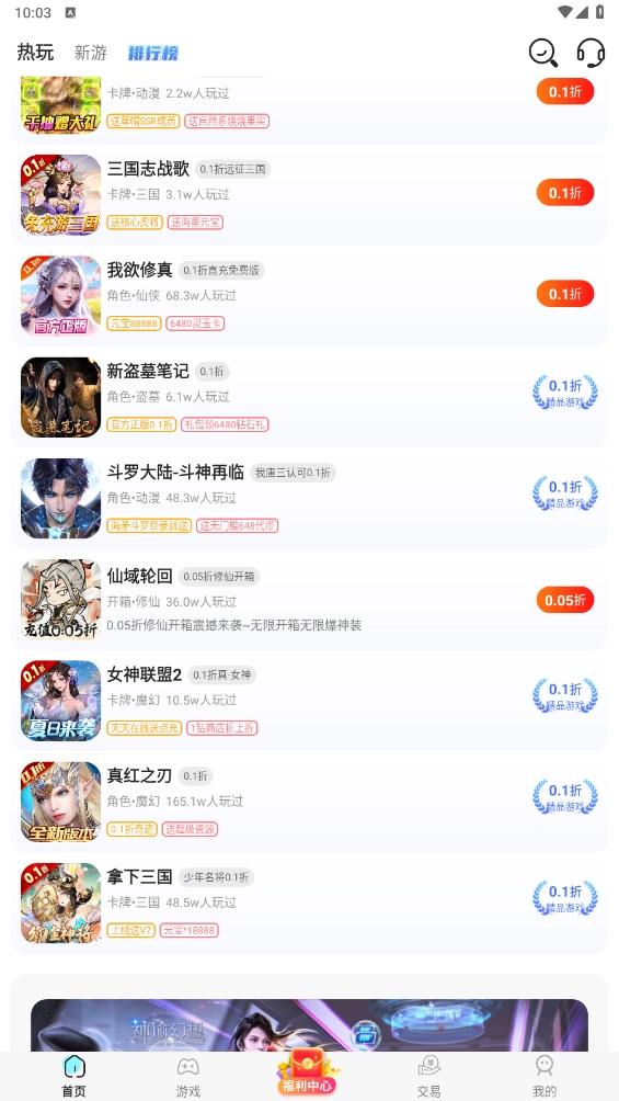 2、打开软件,首页涵盖了热游、新游、排行榜等等资源。