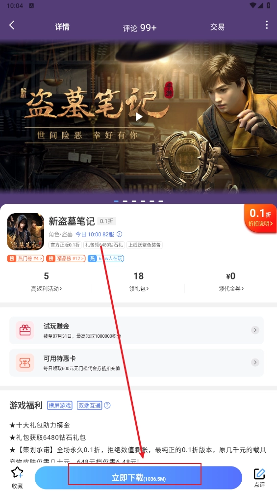 3、下滑海量游戏低至0.05可以畅玩,一键打开你喜欢的游戏,点击底部"立即"即可安装体验。