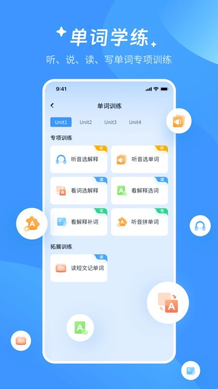 - 看词选义、看义选词、看义拼写、听音选义、听音选词、单词听写、单词跟读、句子填词等多种题型让你全方位掌握单词。