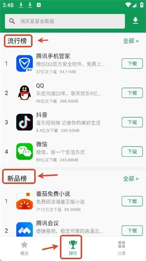 2、排行榜榜单:提供流行榜、新品榜、畅销榜,自由热门应用。