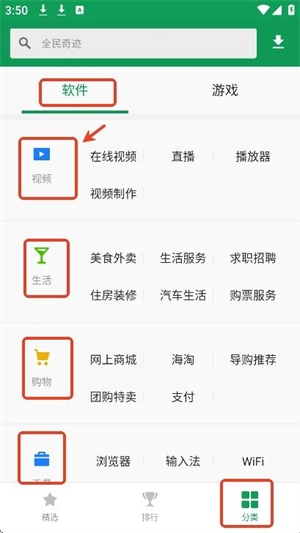 2、根据分类筛选出自己感兴趣的软件并安装,有生活类,购物类,工具类等。
