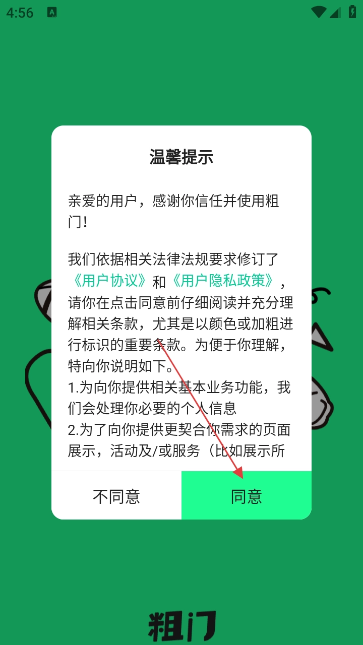 1. 初次打开粗门应用时,在温馨提示弹出的窗口点击【同意】,即可进入应用。