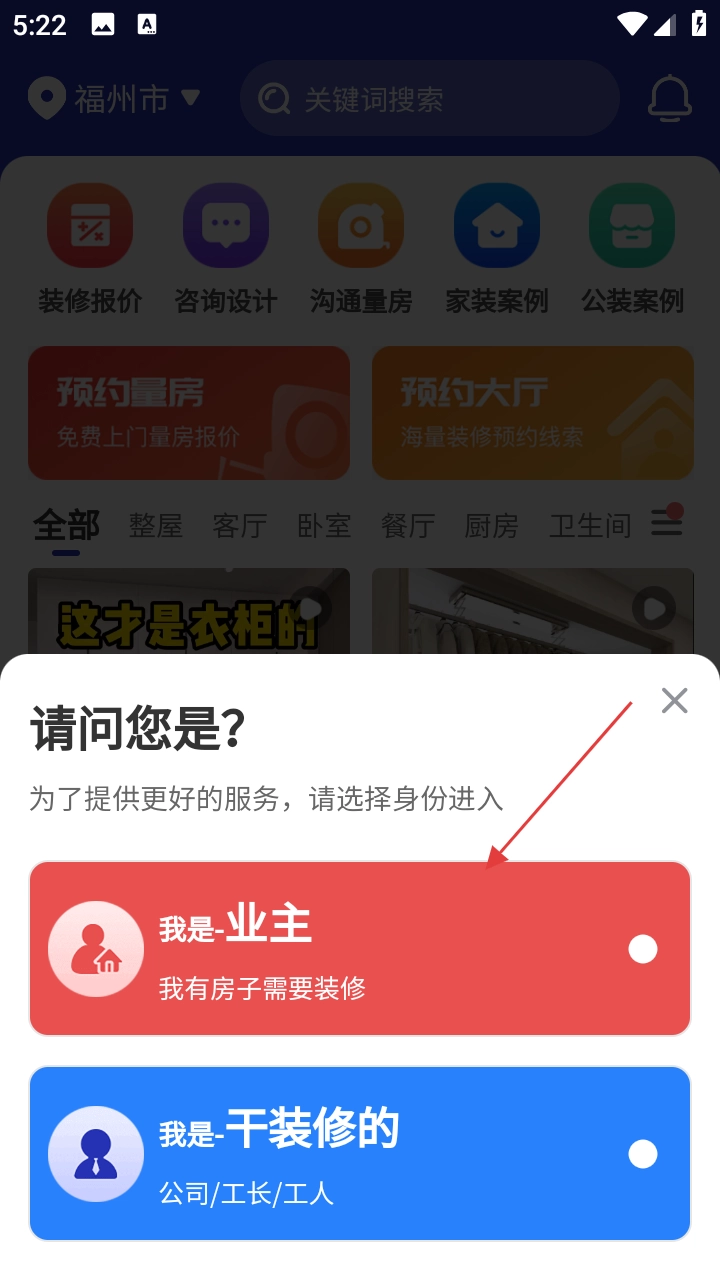 1. 开启应用,留意弹窗并选择【我是业主】选项,借此以业主身份进入。