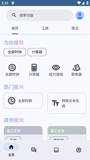1.打开软件主页面,会推荐一些日常可使用的工具。