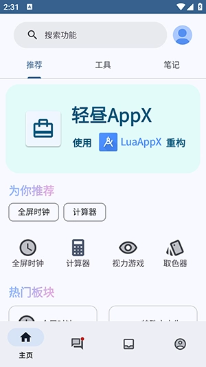 轻昼AppX是一款基于安卓系统自主研发的手机工具箱类软件,能够满足大众对工具箱使用的需求。该软件整合了一些软件,拥有众多实用功能,而且所有功能都免费。不管是在工作、日常生活,还是学习场景中,这款软件都有一定的应用价值。