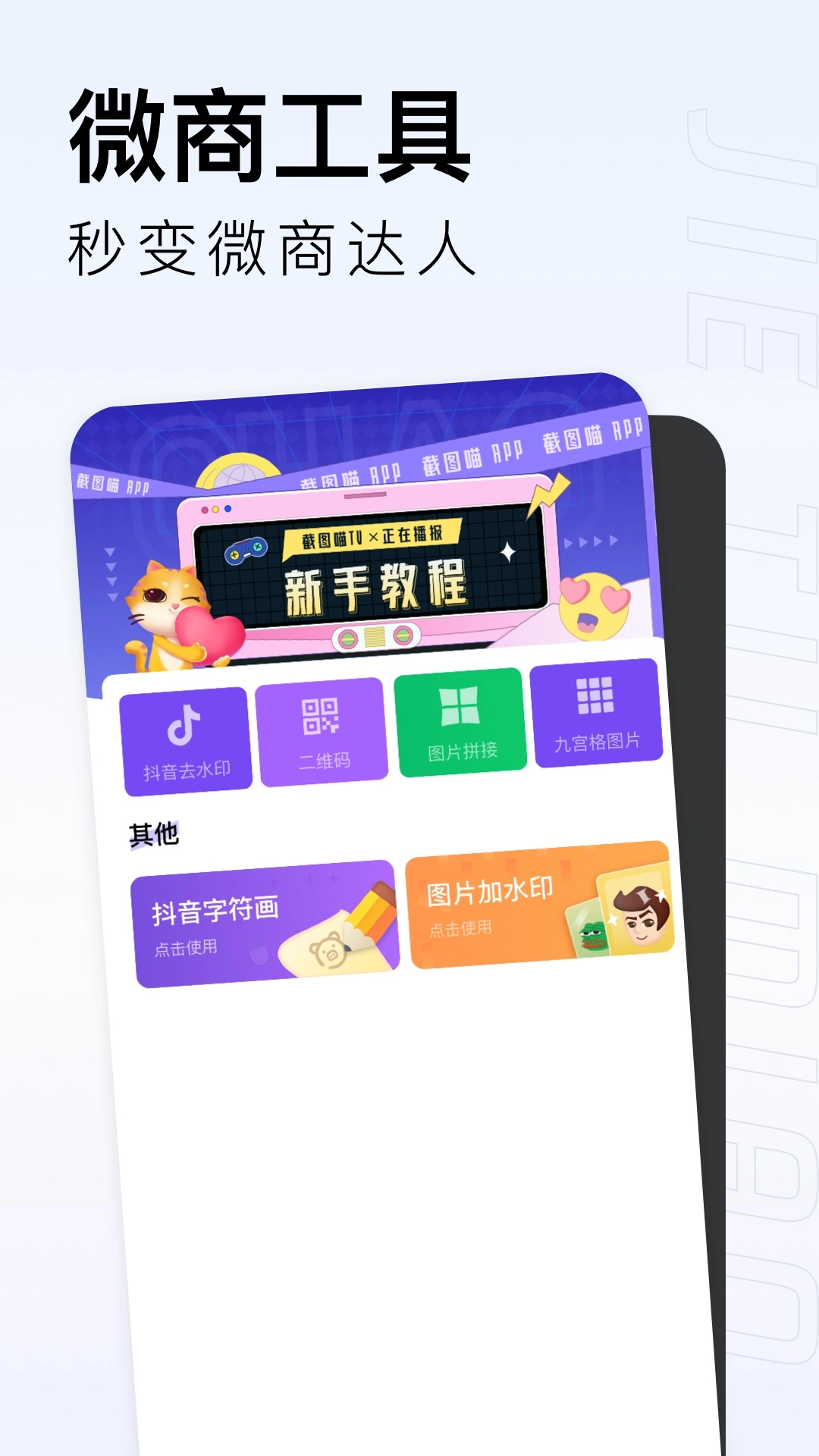 截图喵,一款专为微商营销打造的简单实用图片编辑软件。软件内编辑工具丰富多样,借助这些工具,用户能轻松制作出专属作品,把想要表达的含义完美融入其中。如此一来,他人观看作品后,便能深入了解相关内容,有效促进信息传播。