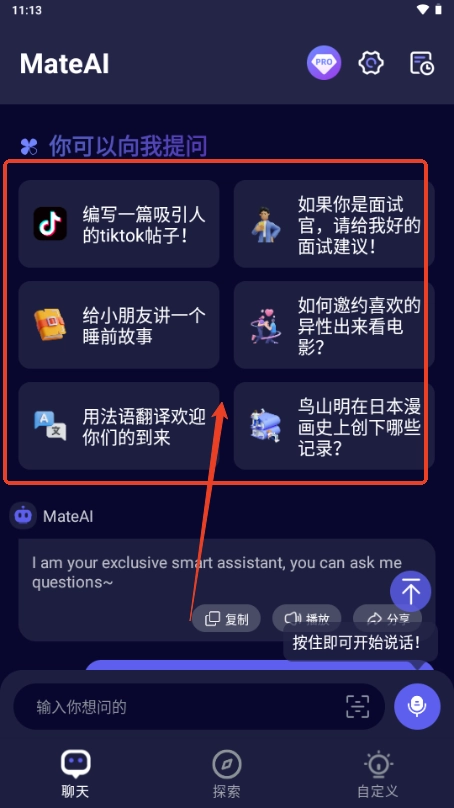 MateAI 配备了现成的提示,可帮助您轻松处理任何任务。 无论您需要专业建议来解决问题,还是需要指导来应对各种挑战,MateAI 都能为您提供帮助。