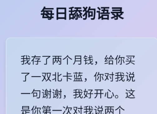 1.随机生成:基于预设的“舔狗语录库”,一键生成不重复的经典语录(如“你是我生命中的唯一光,虽然你可能不知道我的存在”)。