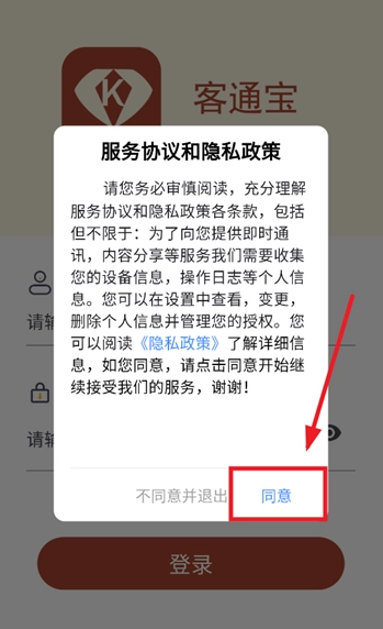 请先安装客通宝,安装完成后打开该应用。打开时,需同意服务协议以及隐私政策。
