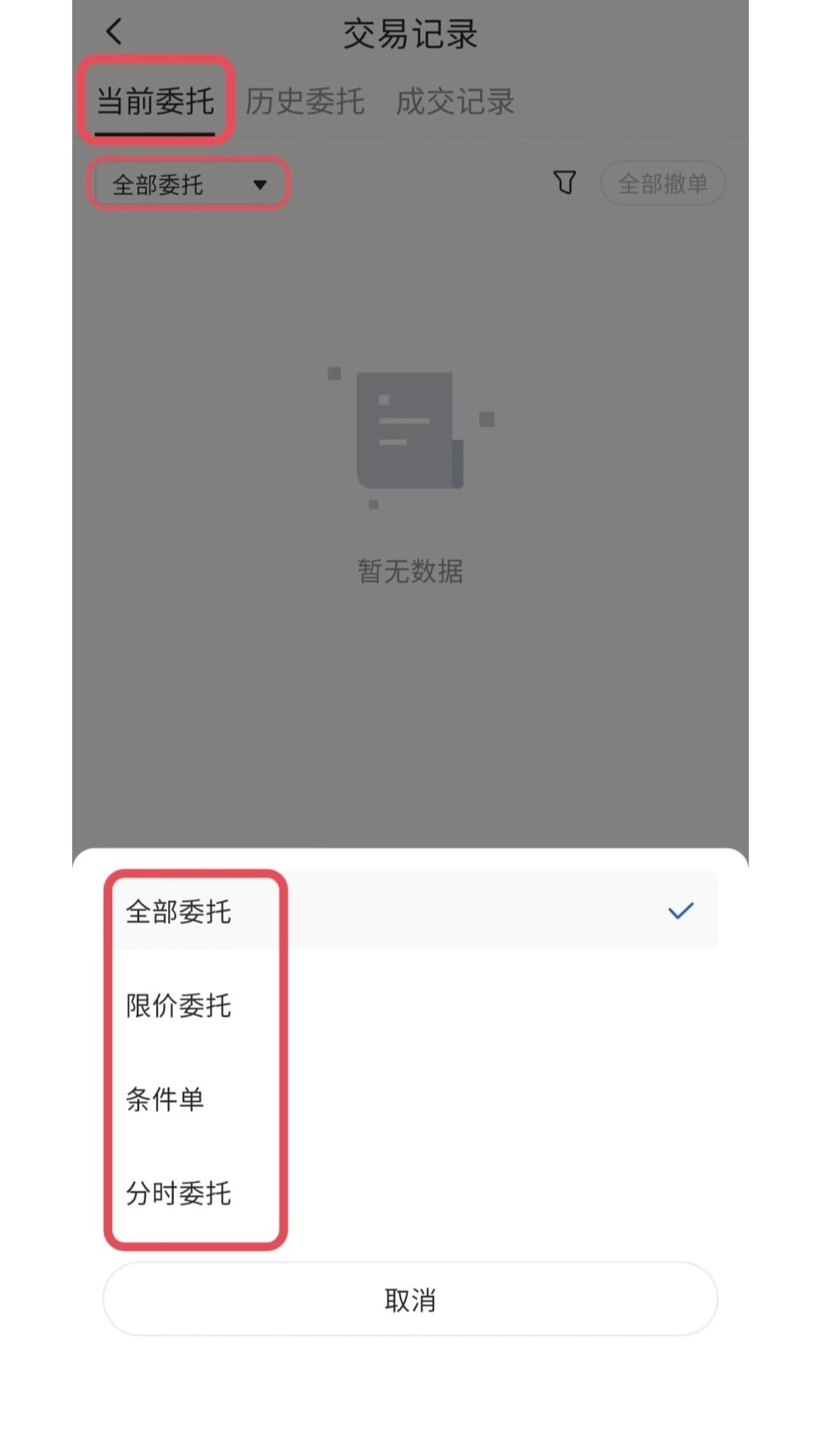 4、详细的委托记录可以在“当前委托”和“历史委托”中进行查看。查询时,可以在“当前委托”中点击“全部委托”选择您想查看的类型,也可以点击“筛选”图标根据市场和买卖类型进行筛选或者按照“委托时间”“委托价格”“委托数量”对当前委托进行排序。