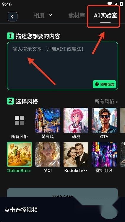 用户们也可以在AI实验室输入文本,快速得到自己想要风格的视频