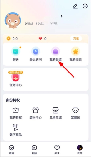 1、打开进入歪歪语音手机版,在“我的”页面内点击“我的频道”;