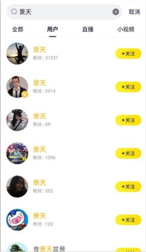 4、另外我们也可以在主页搜索框输入好友昵称关键词,选择用户列表,点击关注;