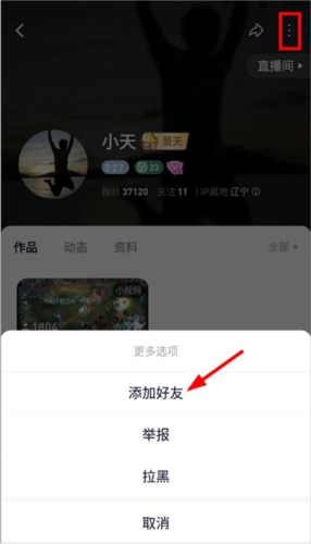 5、在关注后进入用户信息页面,点击右上角的三个点,在下拉中选择添加好友;