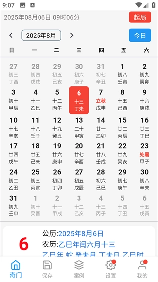 2、在首页可以看到详细的日历信息展示,包含了公历、农历等内容,点击右上角起局进入起局界面;