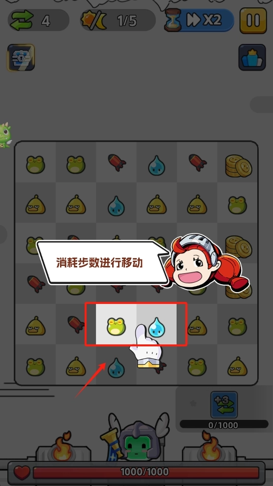 2、在游戏战斗界面,点击角色消耗步数进行移动,选择目标进行攻击。