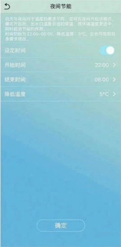 设定时间内出水温度会自动下降5℃(可调整),稍低的室温,不仅节能还更利于提高睡眠质量。