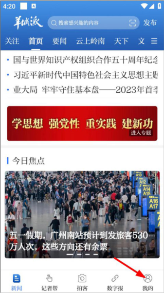 1、打开羊城晚报电子版,登录进入首页,用户可在首页查看每日新闻要闻、今日焦点等,点击我的;