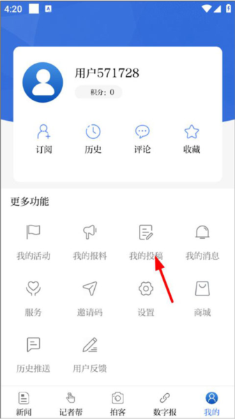 2、我的页面中用户可查看订阅、历史、评论、收藏等,找到更多功能,点击我的投稿;