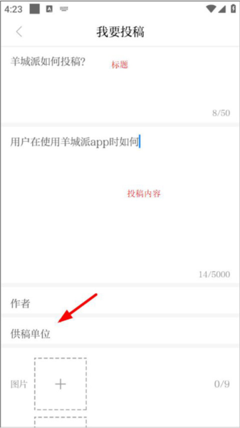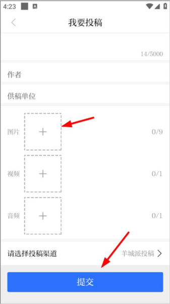 4、进入投稿编辑页面,用户需要输入稿件标题、内容、作者、投稿单位、图片/视频等,选择投稿渠道,点击提交即可投稿。