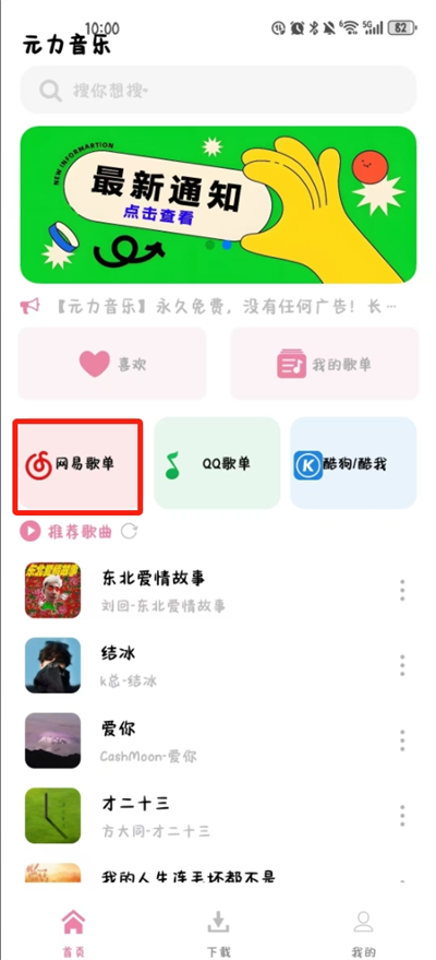 9、接着返回主页面的首页就可以点击网易云音乐中进行查看,这时候导入的歌单都可以看到了;