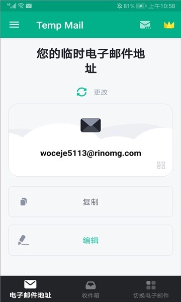 需要说明的是,该软件并非通过注册让用户获取无限量的邮箱地址,而是生成临时性邮箱。它以10分钟邮件的方式,提供临时、匿名且免费的一次性电子邮件地址。这种方式会销毁所有生成的临时邮箱,不过用户使用这些生成的临时邮箱所发邮件的所有回复邮箱,依旧会保存在用户绑定的个人邮箱中。