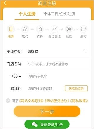2、选择个人或商户,再选择主体申明,输入商店名称、手机号、验证码后,点击下一步按照提示操作即可开店。