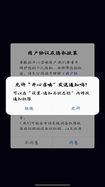 1、安装开心召唤,完成安装过程后,点击软件图标打开,进入其中同意相关协议,再授予相应的使用权限;
